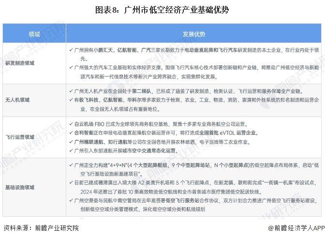 广州低空经济产业在研发制造、无人机、飞行运营和基础设施保障方面均形成一定基础,城市深厚的整车和零部件制造业也易于向低空飞行器生产链转型。