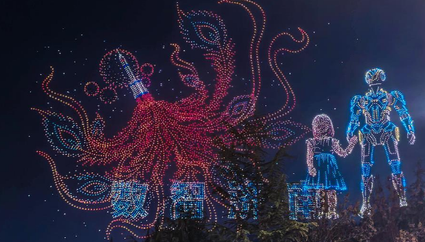 如果你上个月在合肥分会场观看春节联欢晚会,可能会看到一些感觉不像节日庆典、更像科幻小说场景的画面。在漆黑的夜空中,上万盏灯完美地同步移动,形成骏马的图像。但这些
